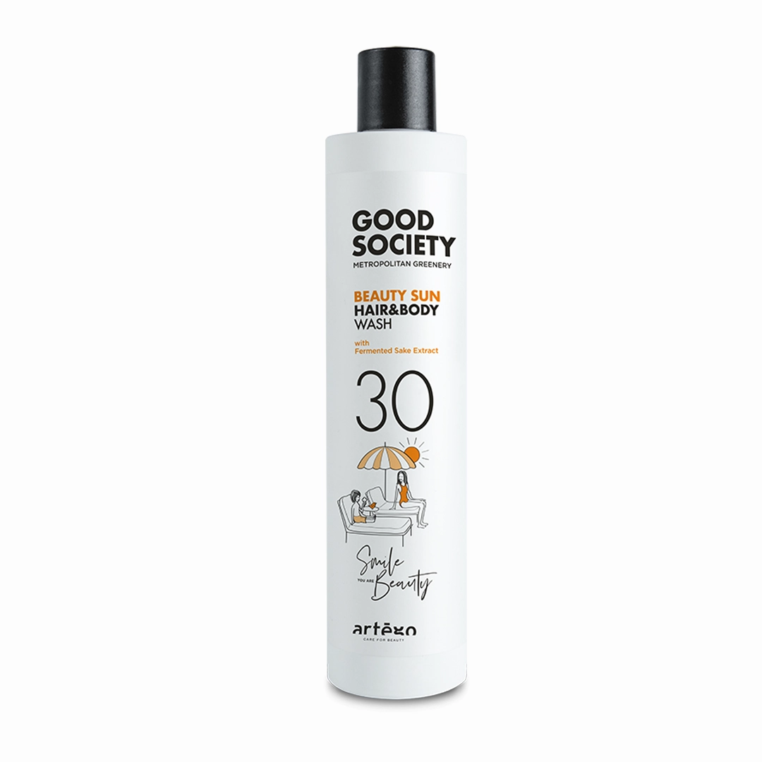 Serien Beauty Sun från Good Society - Artego, vårdar och skyddar ditt hår mot skador från UV-strålar, sol, salt och klor. Rik på antioxidanter och naturliga ingredienser som bevarar håret friskt och glansigt även under soliga sommarmånader, semesterresor och strandhäng. 100% vegansk.