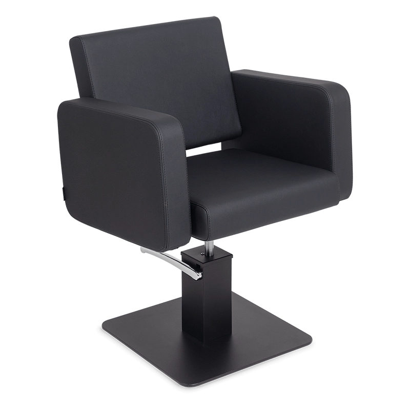 Frisörstol med sida i valbar laminat från Pahi Barcelona. Låsbar pump och klädd i följsamt konstläder. Priset avser svart, fyrkantig bas.