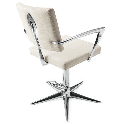 Snygg och stilren frisörstol från Gamma Bross. Stol med fyrkantiga former, låsbar pump, armstöd i polerad aluminium.