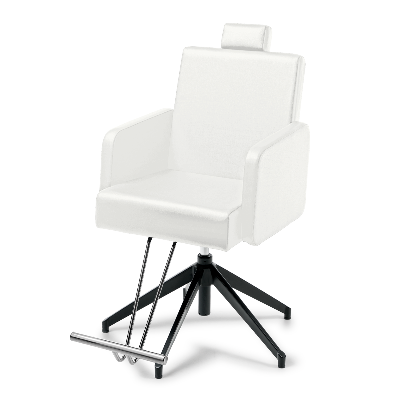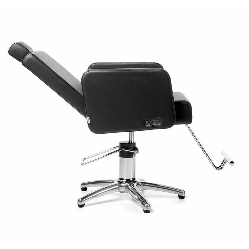 Snygg och skön frisörstol med låsbar pump från Takumi. Fällbar rygg, fotstöd och nackstöd. Går även att få med annan pump.